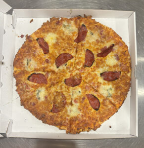 Tomate, emmental, mozzarella, lardons, champignons, fromage de chèvre, chorizo